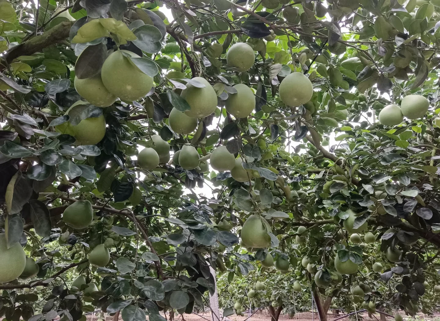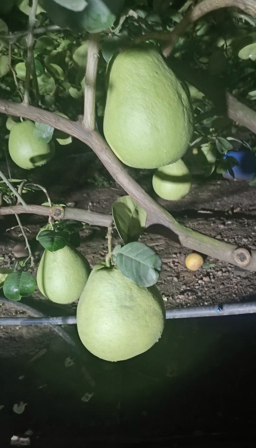 目前处于集中采摘期,果农清晨用剪刀带果柄采收,金黄梨形果实挂满枝头,单果重 1.5~2.5 公斤,采收后直接转运至分拣车间分级。